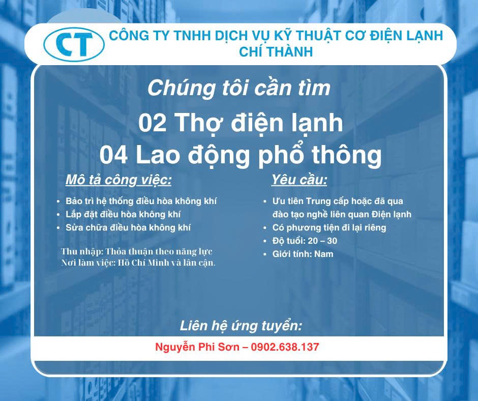 CÔNG TY TNHH DỊCH VỤ KỸ THUẬT CƠ ĐIỆN LẠNH CHÍ THÀNH TUYỂN DỤNG