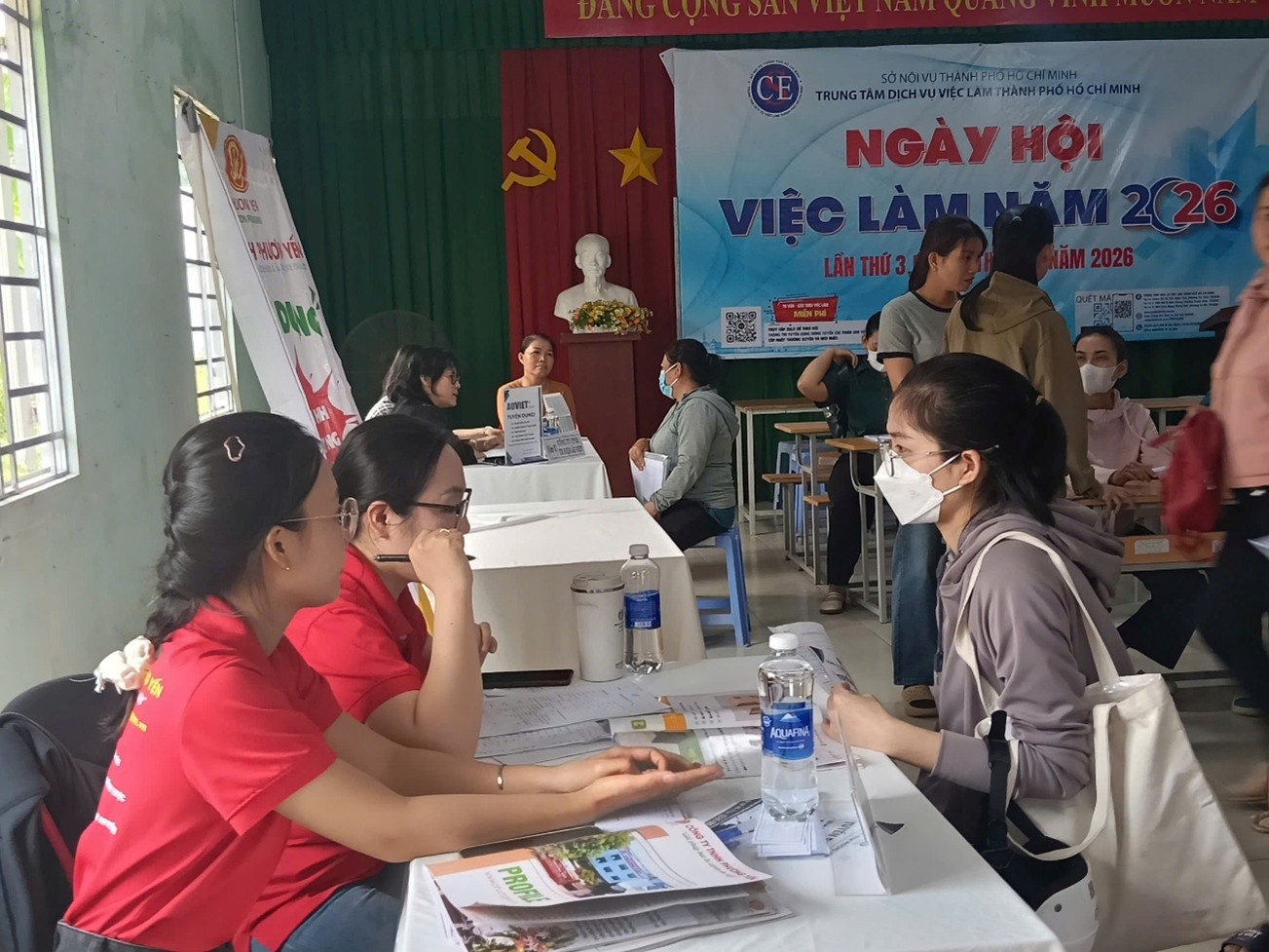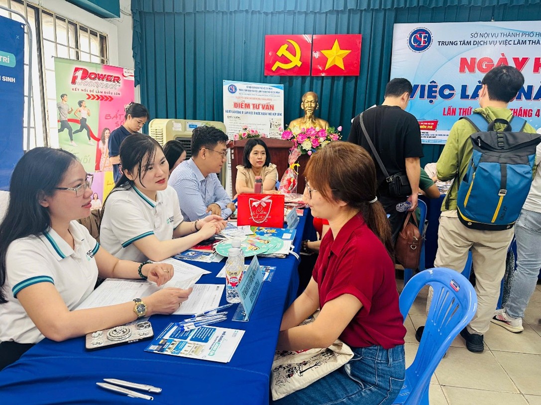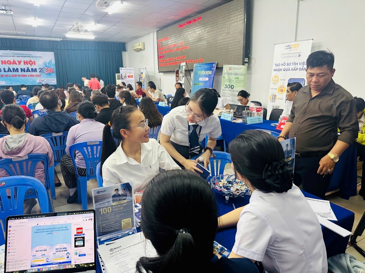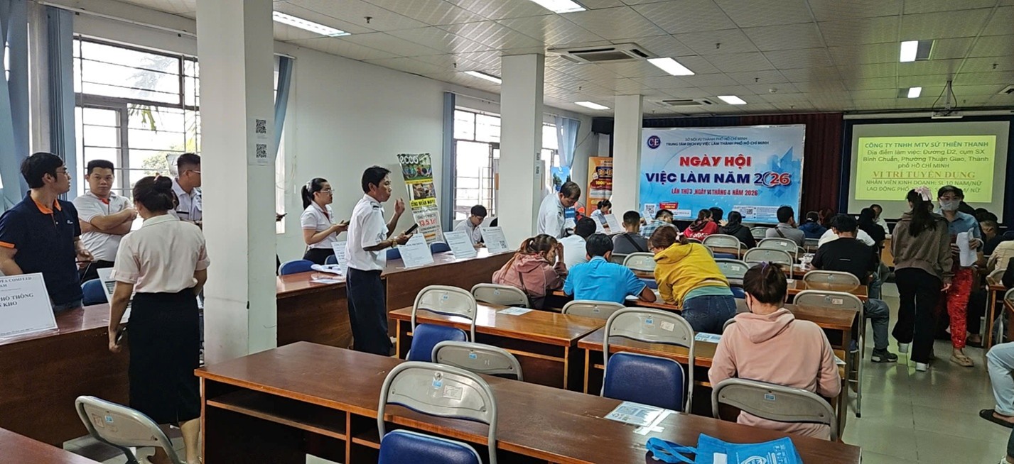Ngày 14 tháng 04 năm 2026, Trung tâm Dịch vụ việc làm Thành phố Hồ Chí Minh tổ chức Ngày hội việc làm trực tiếp và trực tuyến lần 03, quy tụ sự tham gia của 85 doanh nghiệp với nhu cầu tuyển dụng 6.810 vị trí từ các lĩnh vực sản xuất, dịch vụ, tài chính và logistics Ngày hội diễn ra đồng thời tại cả 3 trụ sở và các điểm tiếp nhận Bảo hiểm thất nghiệp – Giới thiệu việc làm, tạo điều kiện thuận lợi cho người lao động tiếp cận với nhều vị trí việc làm hấp dẫn.