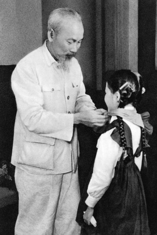 Chủ tịch Hồ Chí Minh quàng khăn đỏ cho đại biểu thiếu nhi Thủ đô đến chúc mừng kỷ niệm 30 năm Ngày thành lập Đảng (1960)